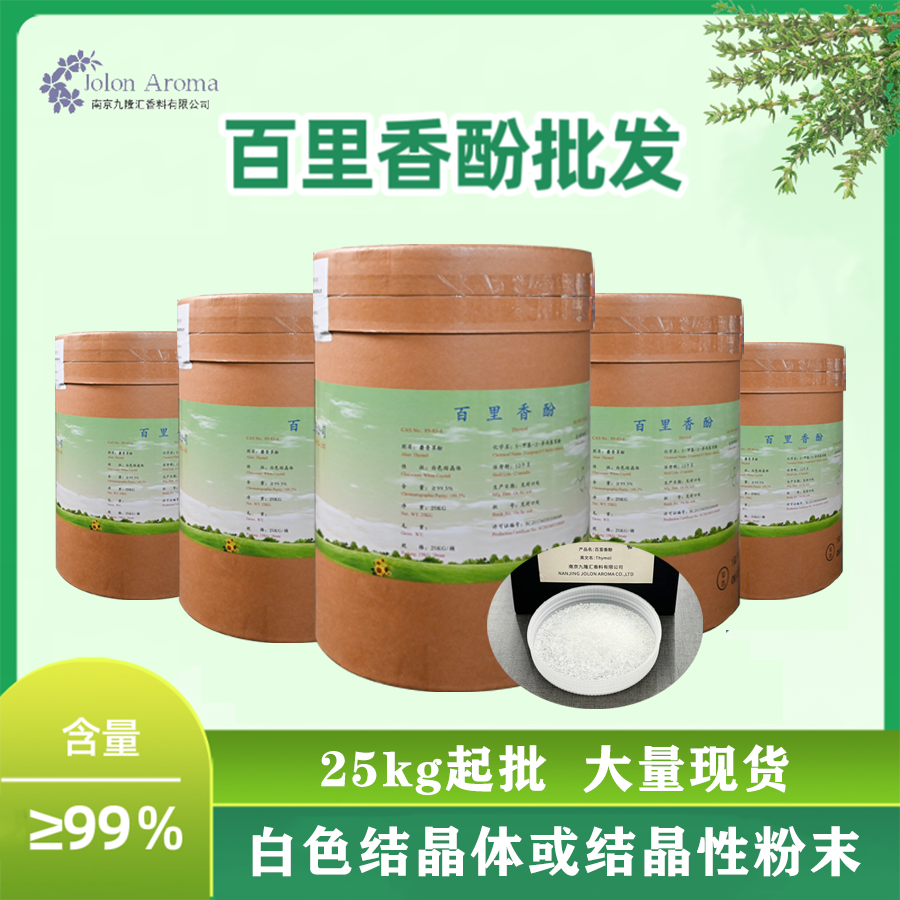 描述:百里香酚白色结晶性粉末,具有百里香油的香气,含量≥99%,用于日化、食品香精的调配、···